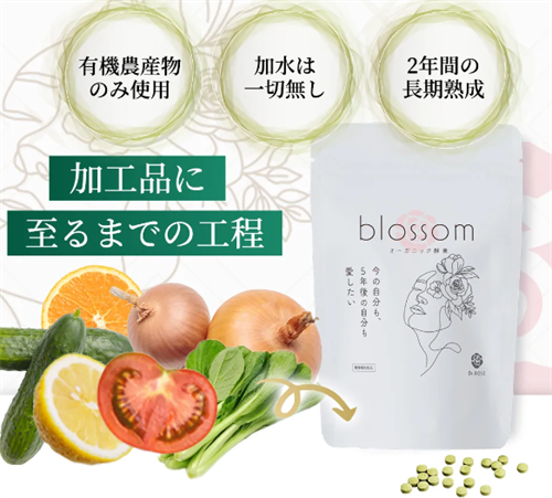 有機酵素サプリ blossom(ブロッサム)は、健康と美容をサポートするために厳選された有機JAS認定の原材料を使用しています。