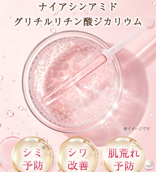 有効成分ナイアシンアミドとグリチルリチン酸ジカリウムが、肌の奥深くまでしっかり浸透し、シワやシミに効果的にアプローチ。