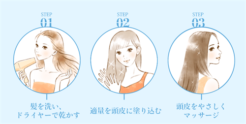 育毛剤を塗布した後、指の腹でやさしく頭皮をマッサージすることで、血行が促進されます。