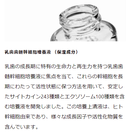 不死化ヒト歯髄幹細胞順化培養液を主成分とし、肌の再生力を高める効果があります。