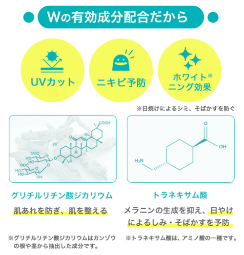 プロアクティブ UVプロテクターには、ニキビ予防効果があるグリチルリチン酸ジカリウムと、日焼けによるシミやそばかすを防ぐトラネキサム酸が配合されています。
