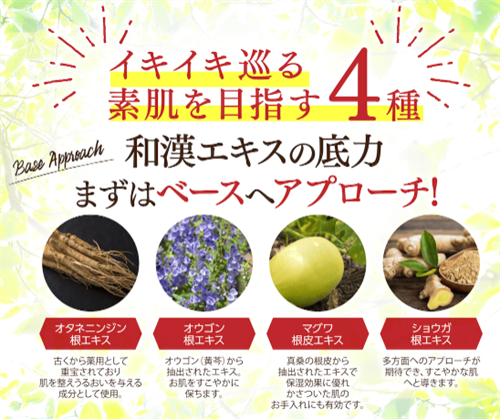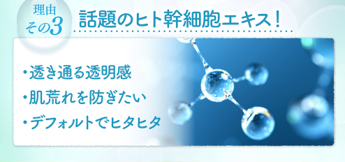 ヒト幹細胞エキスや和漢エキスなど、肌に必要な成分をしっかりと配合し、ゆっくりと肌のコンディションを整えていくのがポイントです。