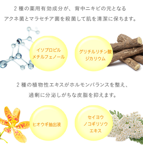 イソプロピルメチルフェノールとグリチルリチン酸ジカリウムの2種の薬用有効成分が、背中ニキビの元となるアクネ菌とマラセチア菌を効果的に殺菌して肌を清潔に保ちます。