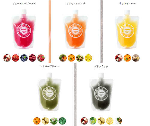 Vegeetsは、ビューティーパープル、ビタミンオレンジ、ホットイエロー、エナジーグリーン、デトブラックの5種類のフレーバーを提供しています。